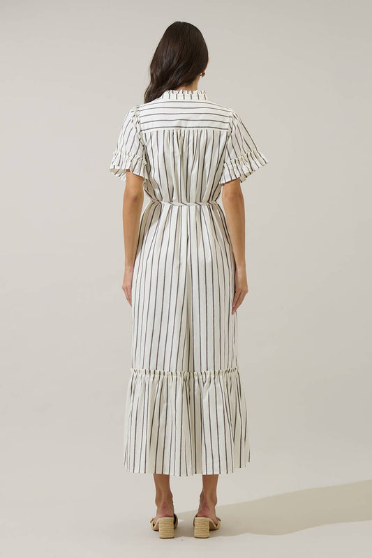 SMOCKED FRONT TIE DENIM MIDI DRESS