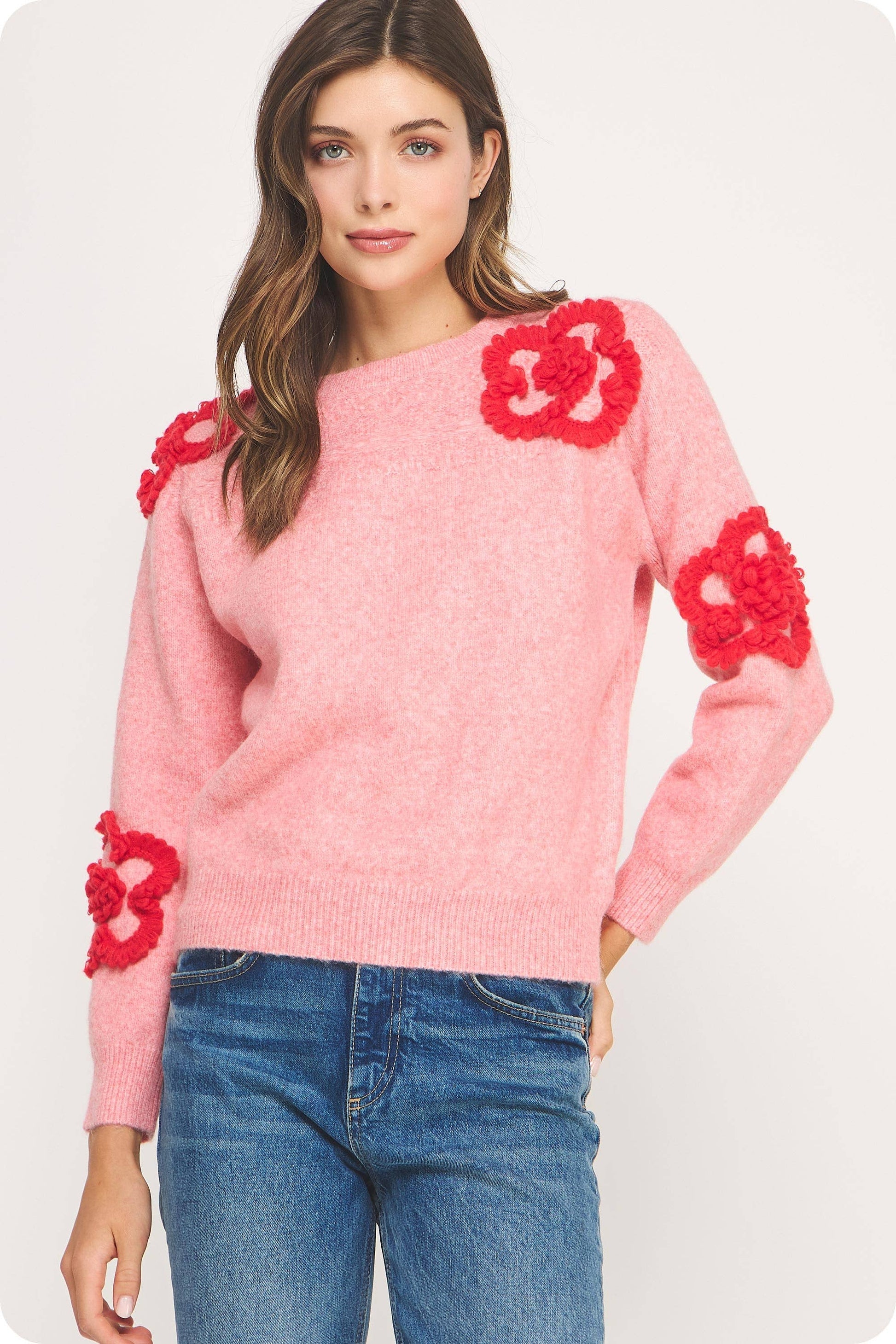 Elevate your everyday look with this charming knit sweater top that brings dimensional florals to life. Crafted from soft, cozy knit fabric, it showcases eye-catching 3D flower embroidery that adds texture and personality to any outfit. Long sleeves finished with ribbed cuffs keep you comfortable, while the round ribbed neckline and hem create a polished, put-together vibe. Perfect for layering or wearing solo, this piece is your new go-to for effortless style with a playful twist.