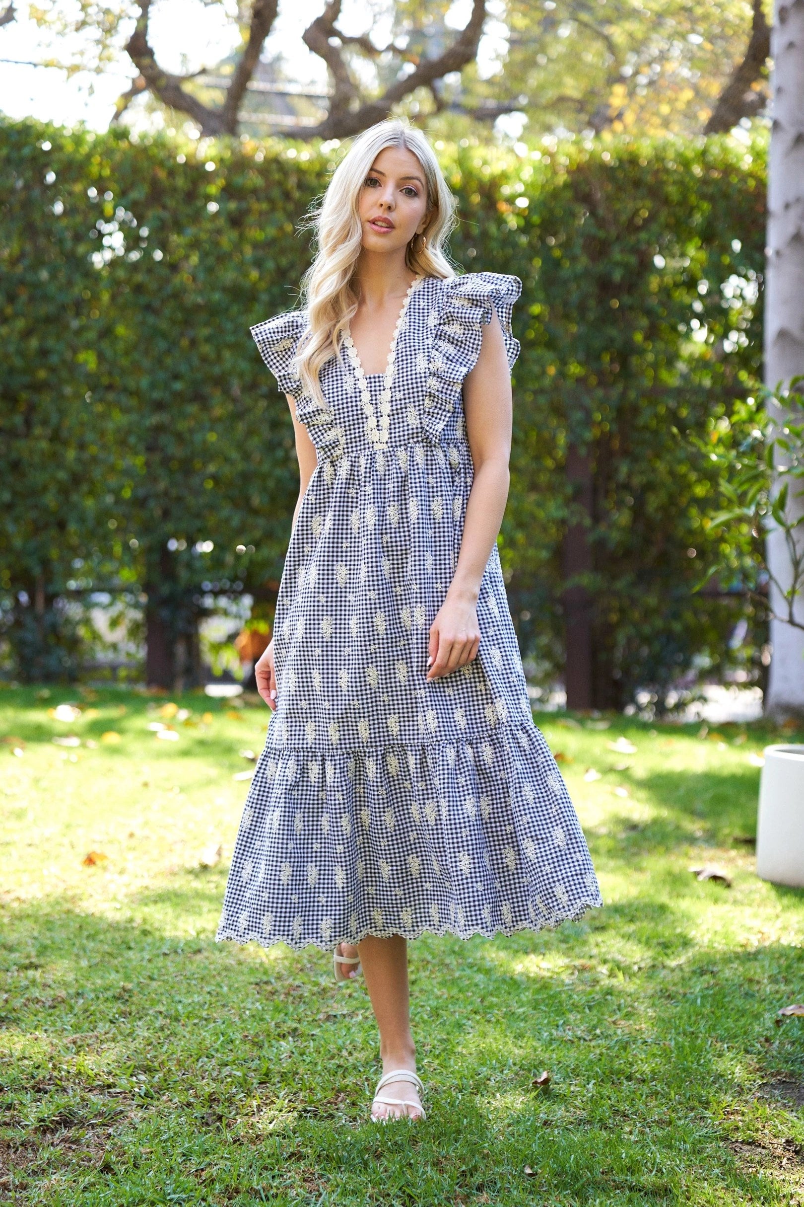 Midi dress featuring a gingham pattern adorned with floral embroidery, complemented by ruffle sleeves and delicate lace accents.