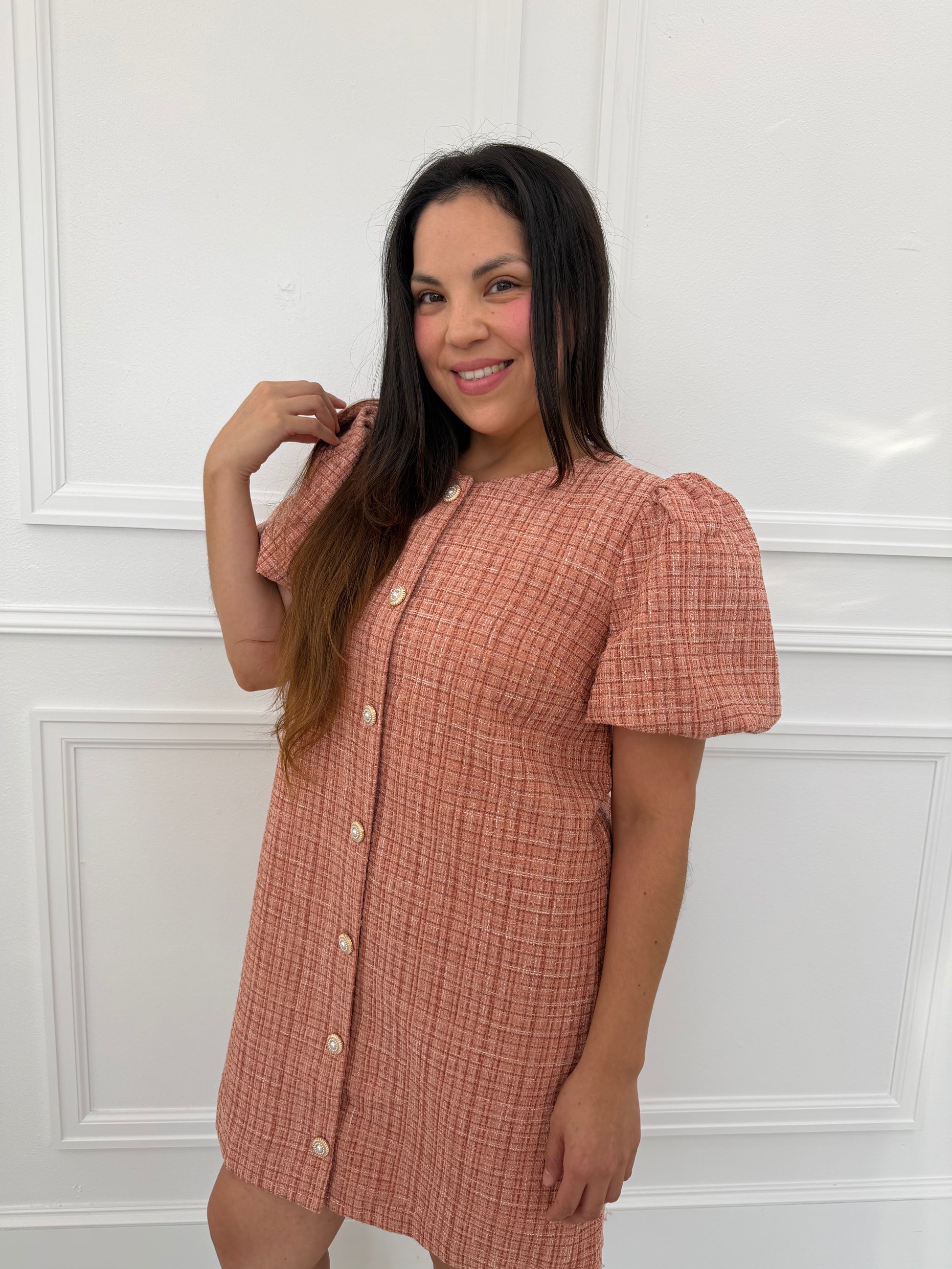 This salmon pink classic boucle dress features a timeless shift mini silhouette perfect for fall. It includes lined bubble sleeves with elastic cuffs, decorative jewel buttons down the front, a back zipper, and a fully lined interior for comfort and style.